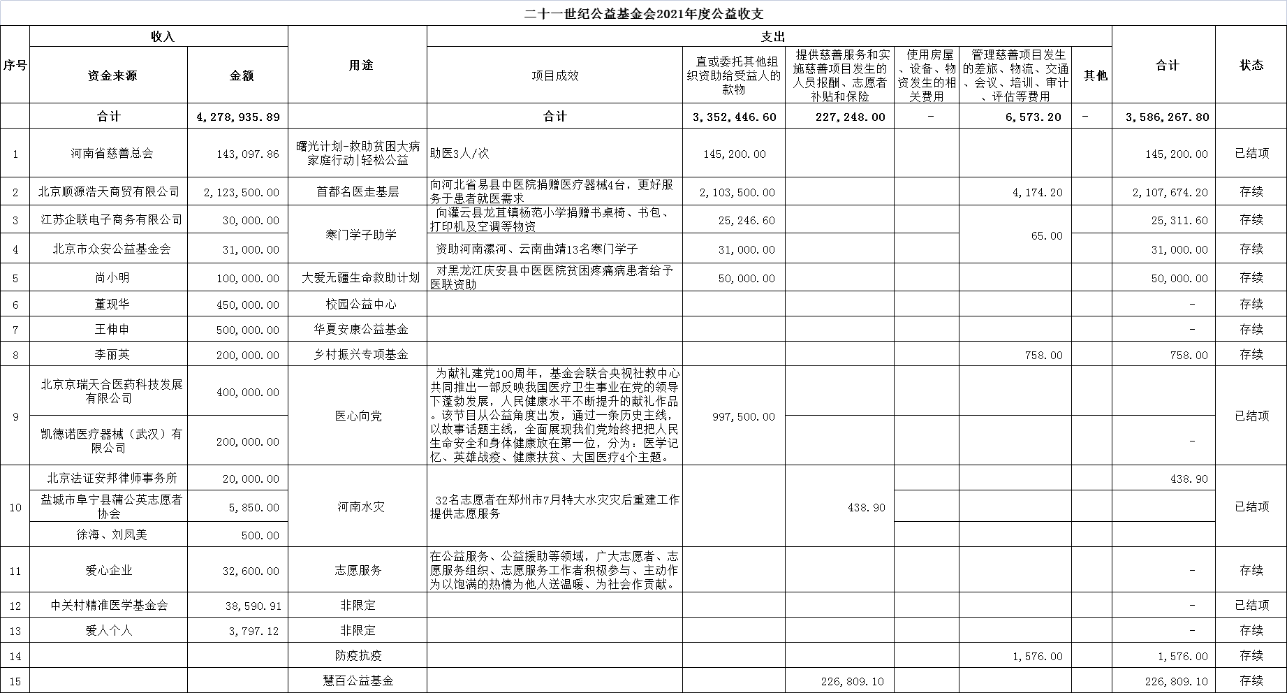 二十一世纪公益基金会2021年度公益收支
